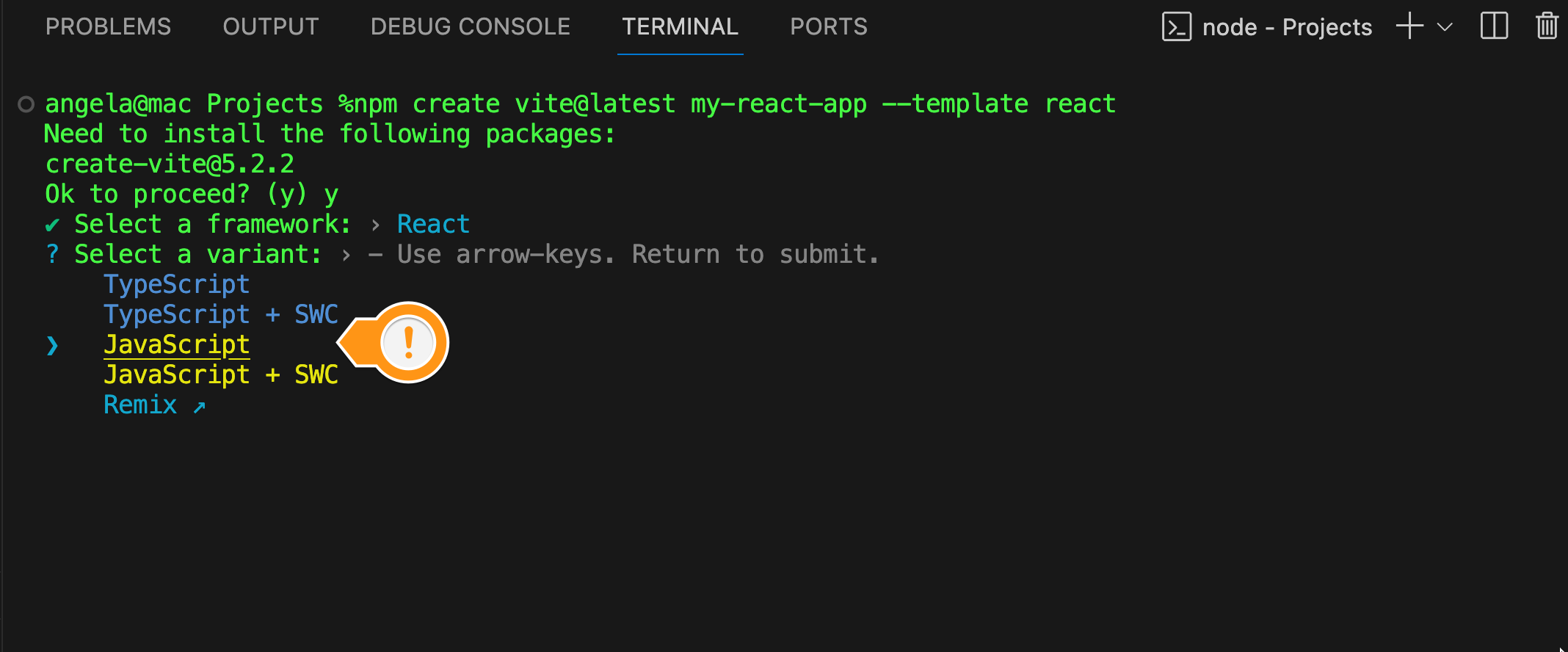 Step 5. The first time, you won't have Vite installed. Type y to proceed. Then you'll be asked to select a framework. Use your down arrow to select React.