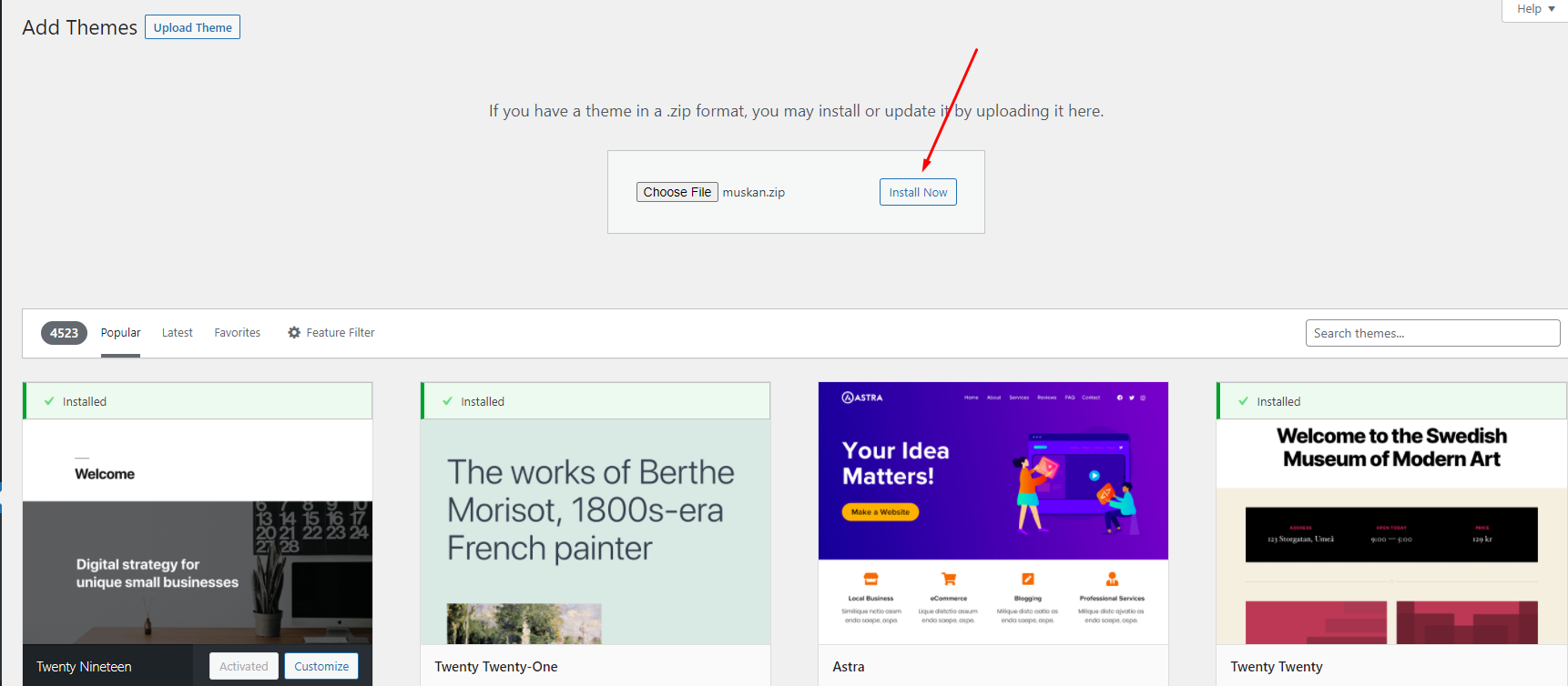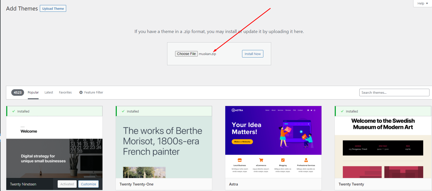 Note: When uploading your theme with the installer, please ensure you are uploading the theme .zip file, not the entire package you downloaded. In this case, you will be uploading NextBit.zip.